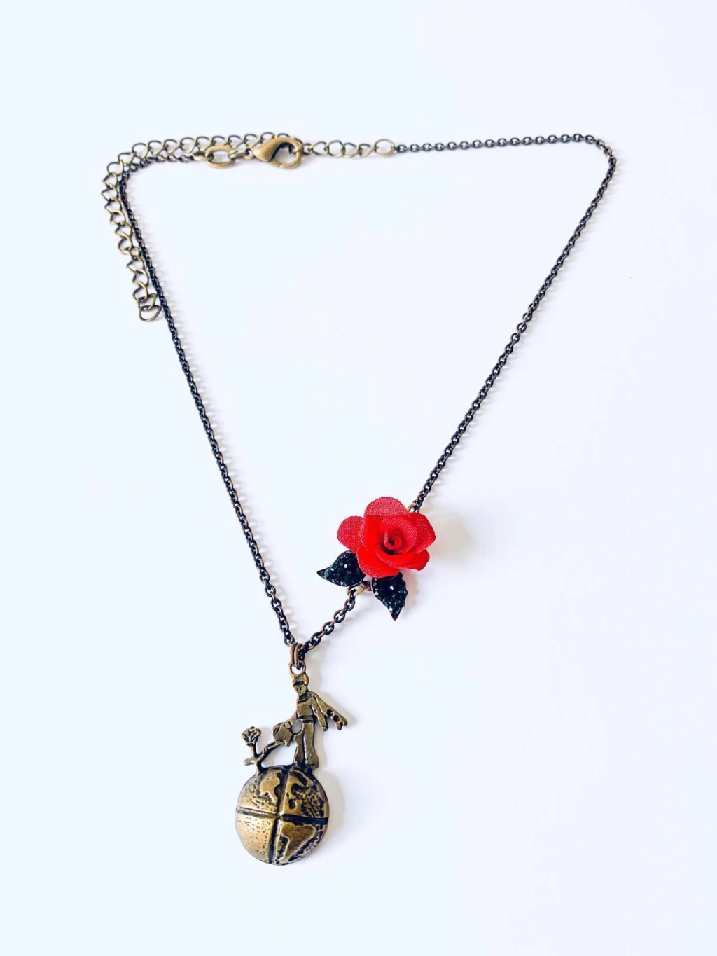 Colar delicado com pingente do pequeno principe e detalhe em florzinha de tecido rosa com folhas em strass verde bandeira.